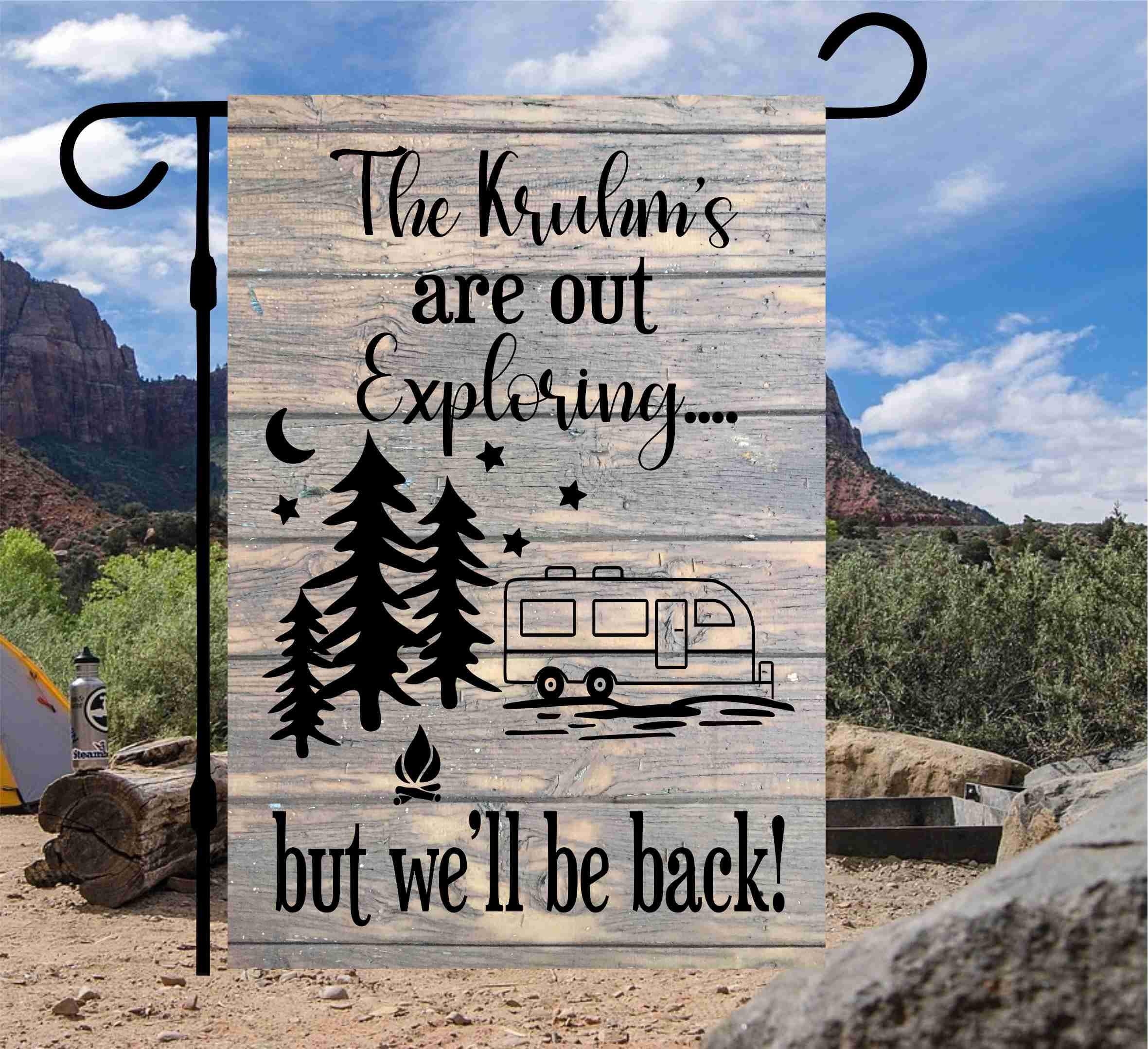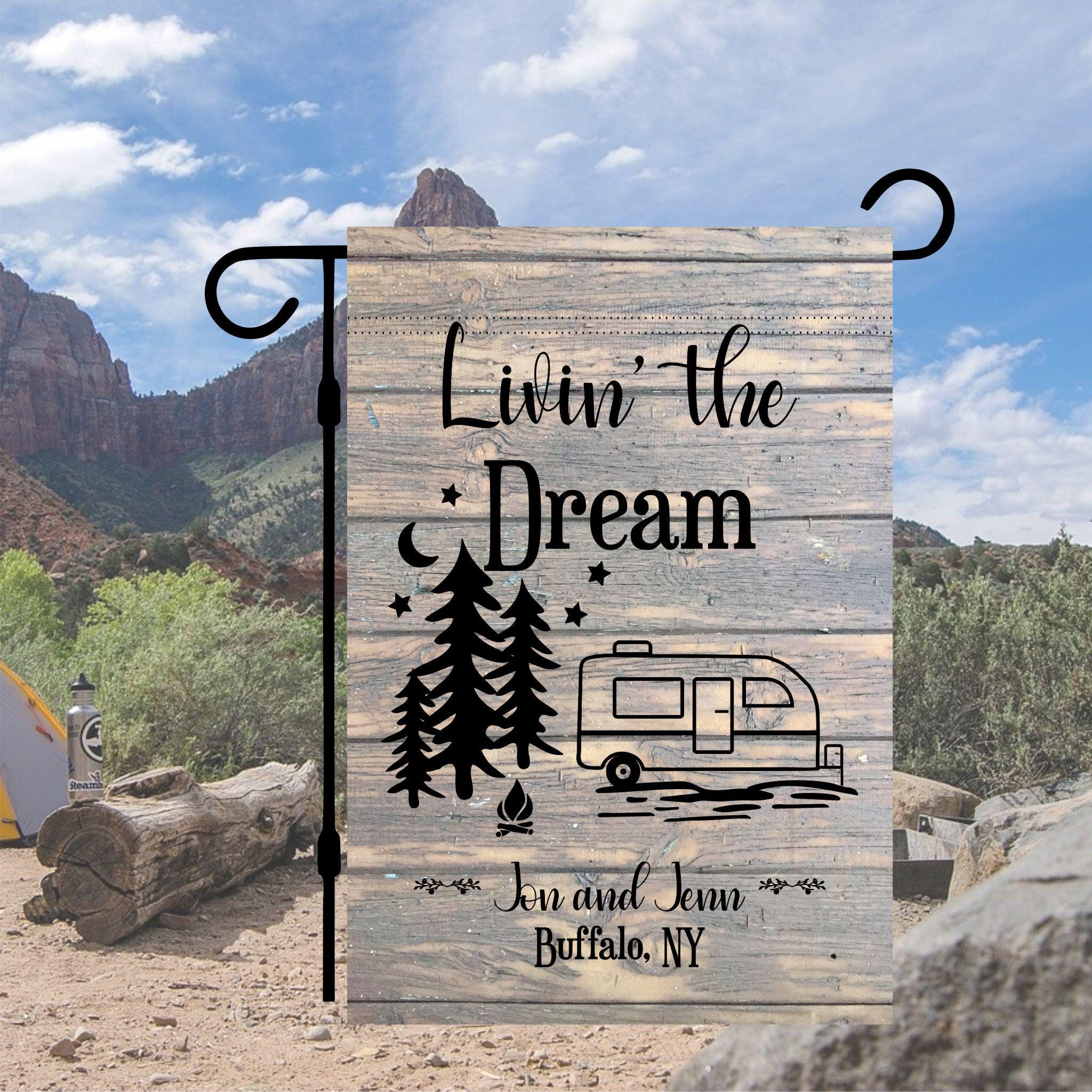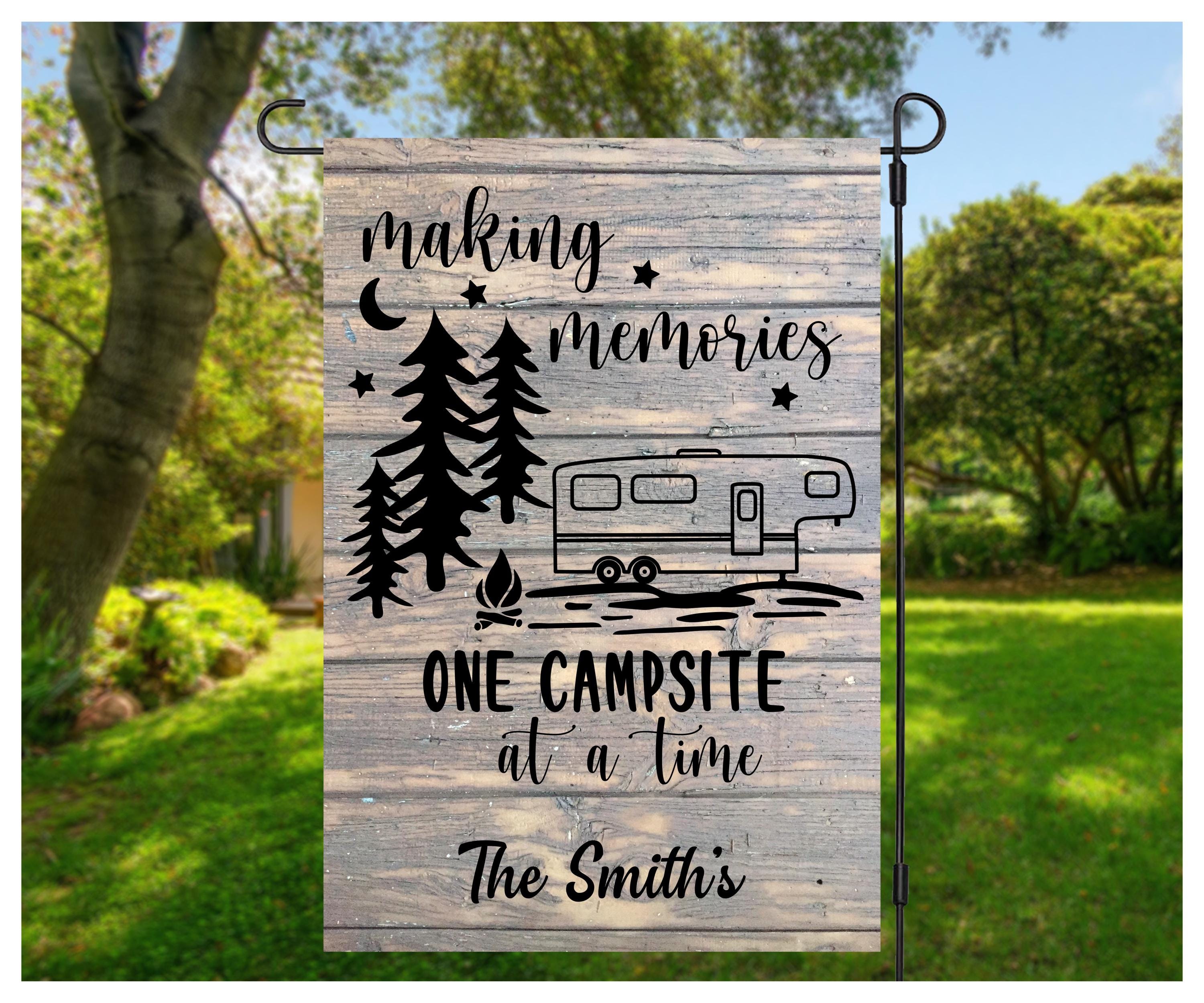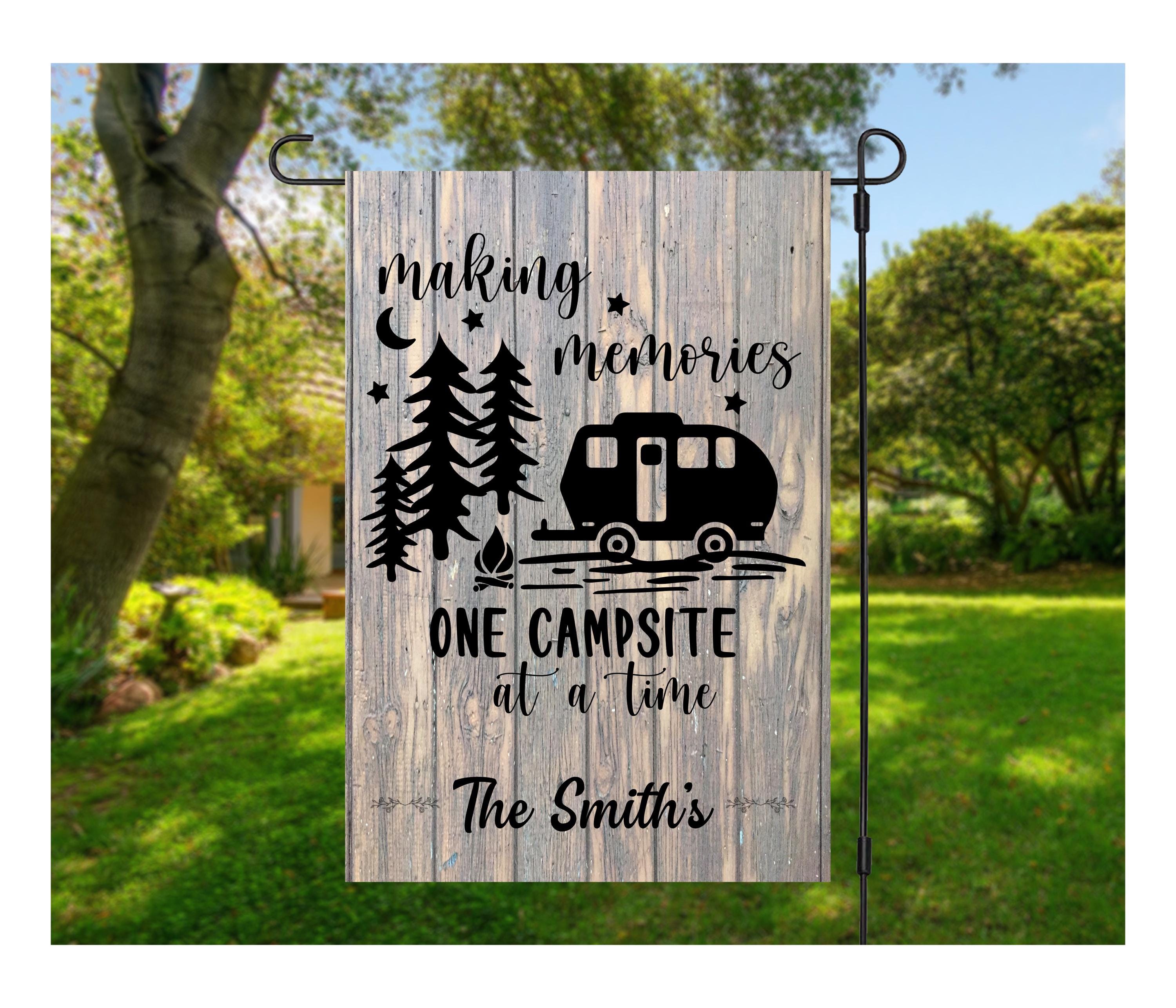 This camper garden flag is a personalized piece of campsite decor that makes a thoughtful gift for any camper and a fun outside camp decoration for your site. Whether you want to show off your rig, welcome fellow campers, or create a little “home away from home,” this customizable flag adds personality to every adventure.