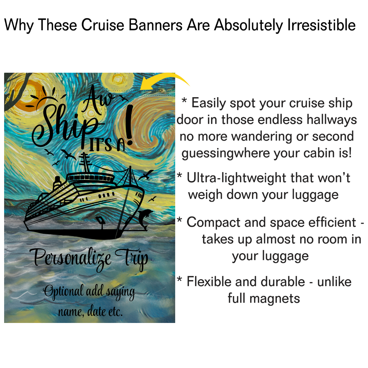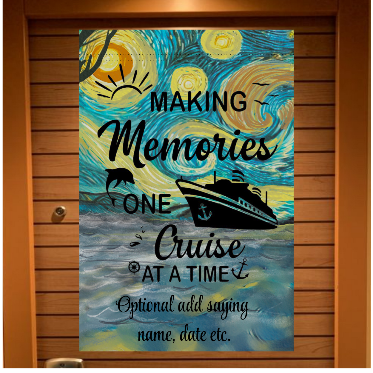 Love this design? Explore our full Cruise Collectio n to find matching magnetic door banners, luggage tags, and personalized keepsakes. Create a coordinated look for your cabin door and make your next voyage unforgettable!