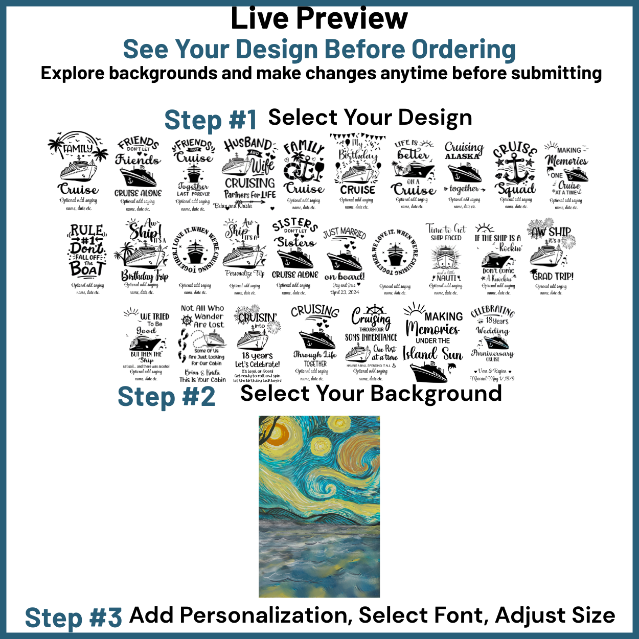 Select Your Design or Background Choose from over 20 fun designs — including this Starry Night style.