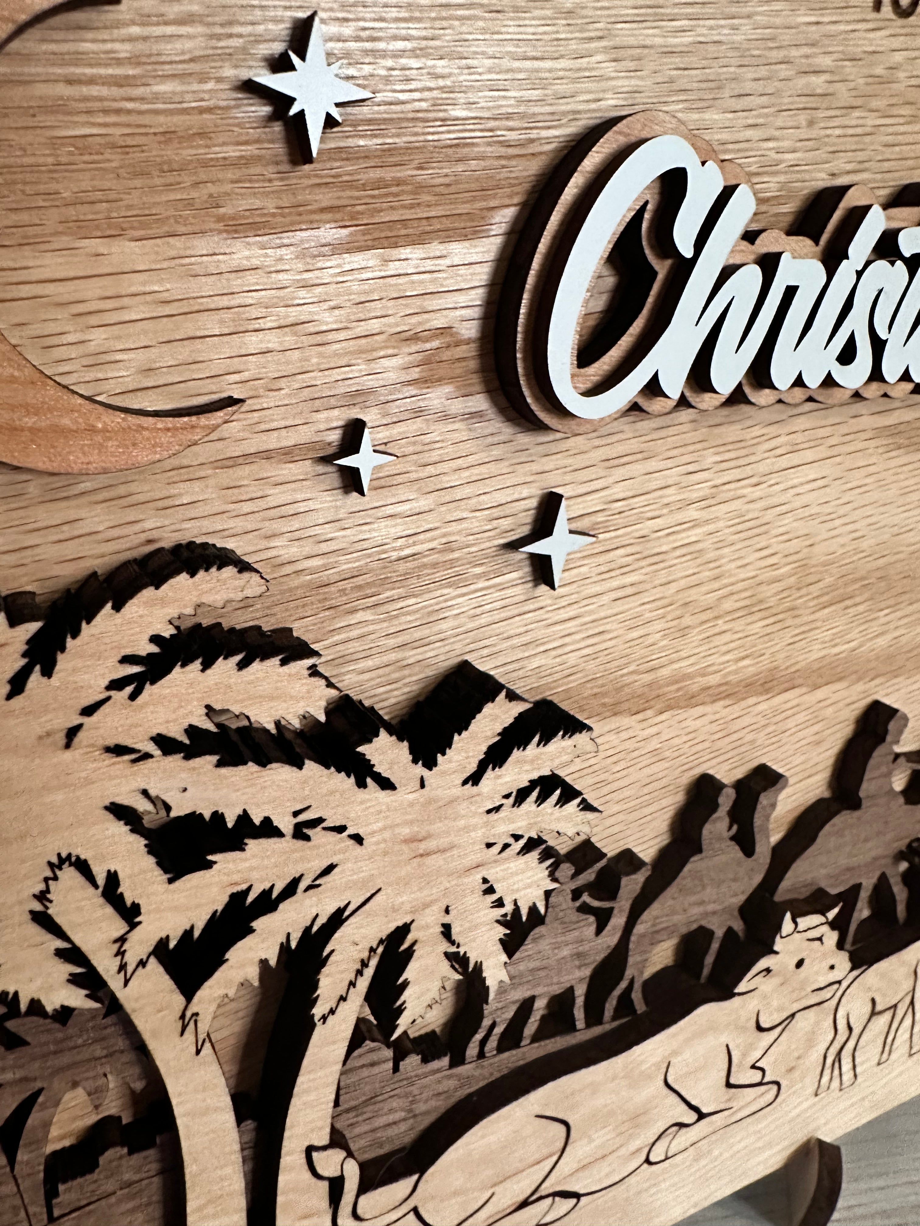 Each sign is meticulously made from three layers of premium wood — red oak, walnut, and cherry — creating rich contrast and depth. Measuring approximately 18" wide by 9" high, it features a layered 3D nativity scene complete with palm trees, animals, the holy family, and angelic figures under a starry night sky. The white MDF lettering adds a festive touch that stands out beautifully against the natural wood tones.