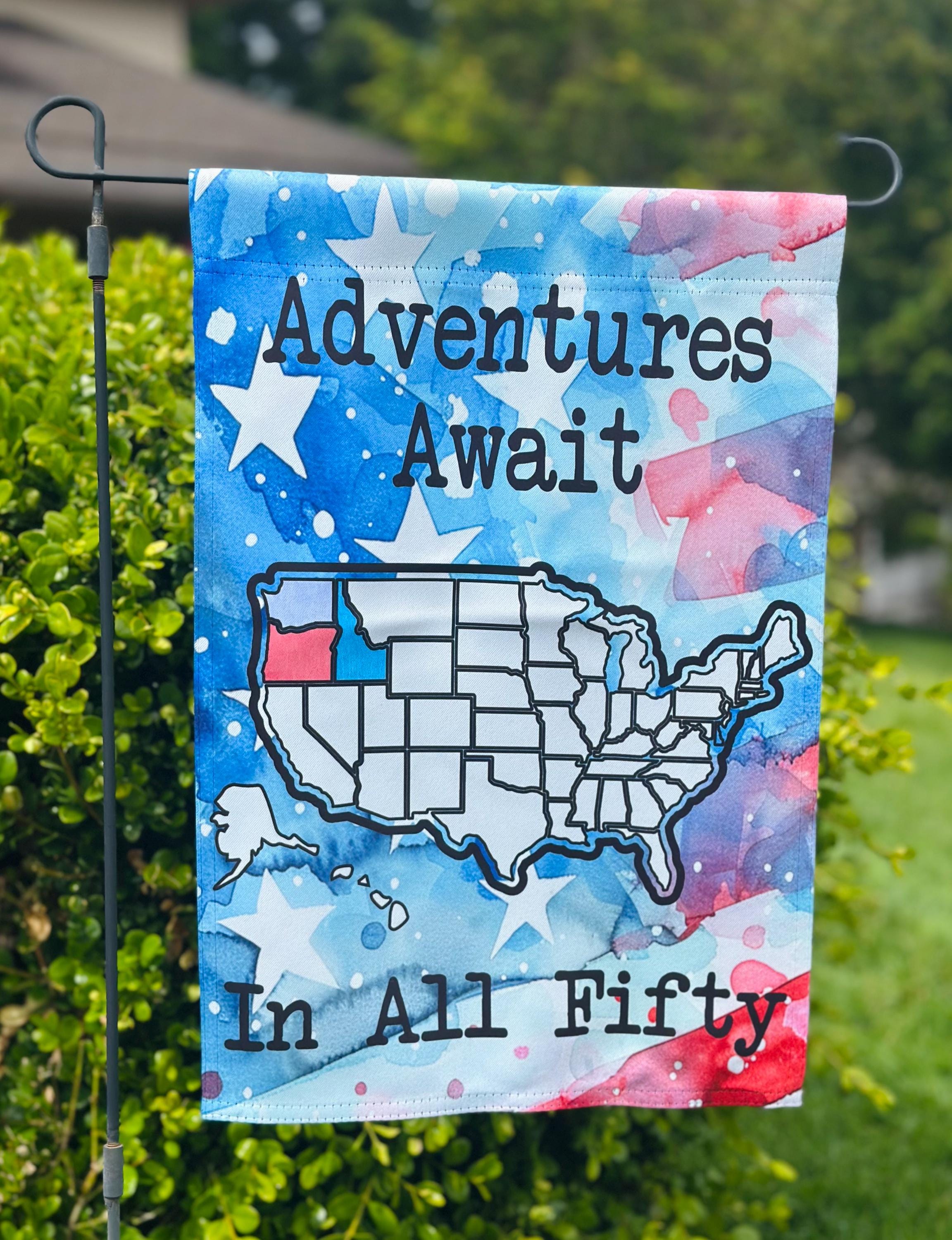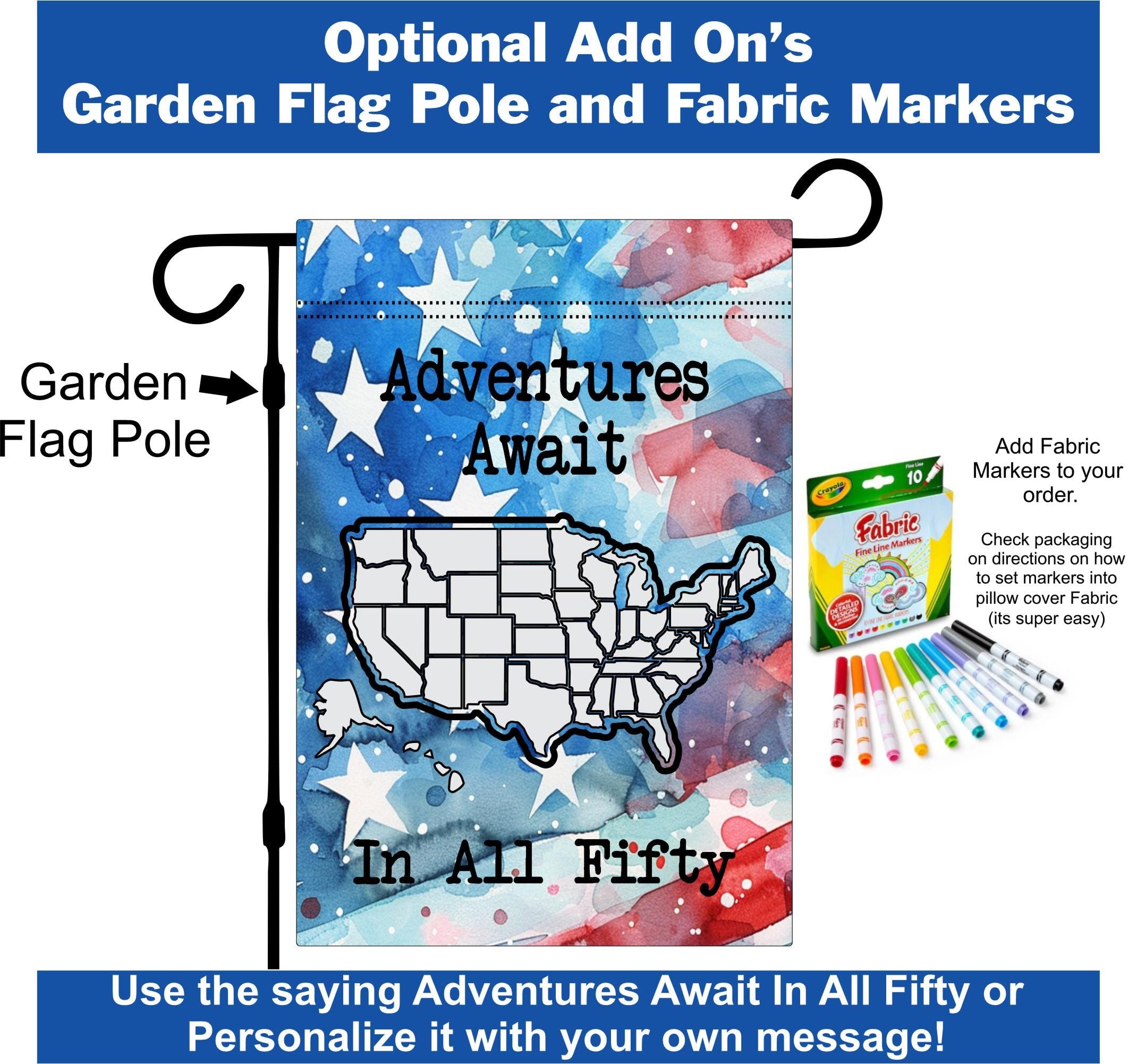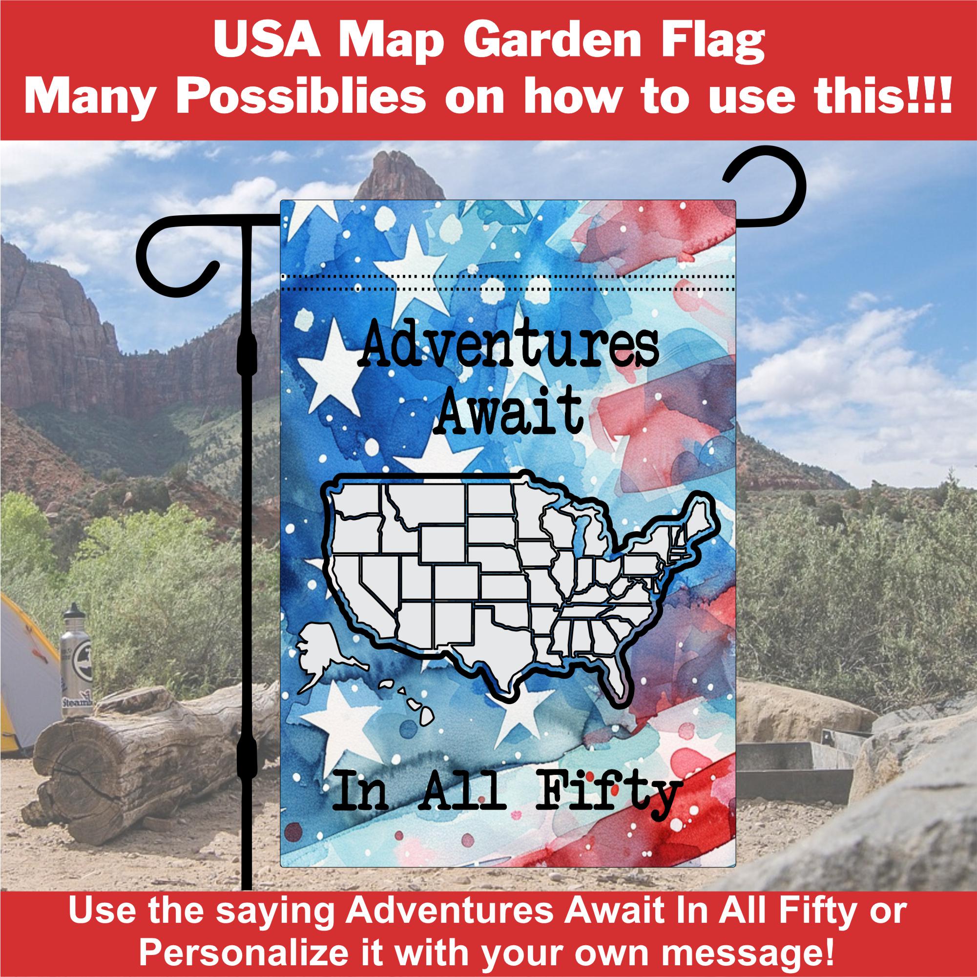 This "Adventures Await in All Fifty" garden flag is the perfect way to celebrate your road trip memories and display your love of travel. Featuring a USA map outline, this interactive flag is ready to be colored in as you explore each state. It makes a fun and meaningful keepsake for families, RV travelers, and adventurers of all ages.