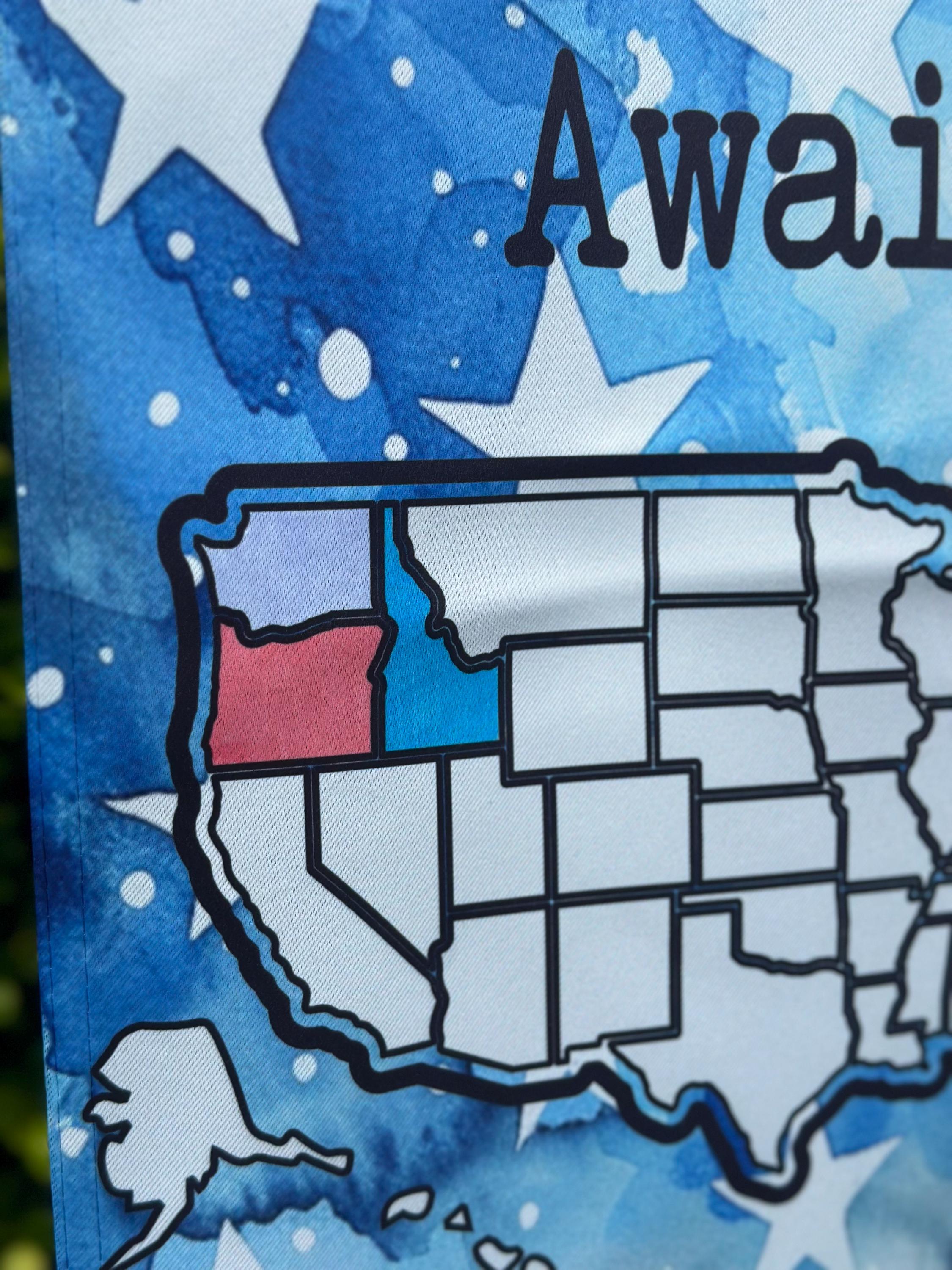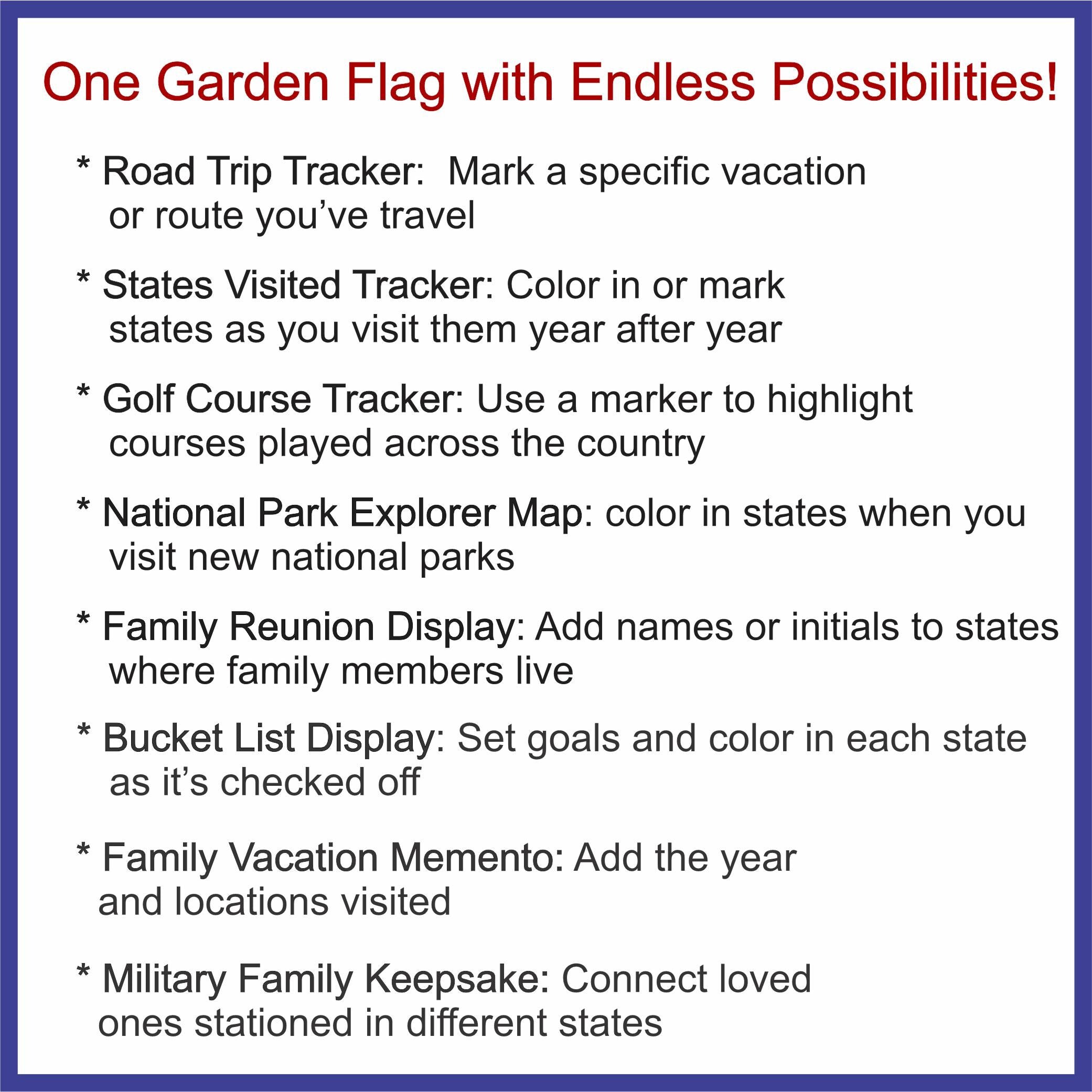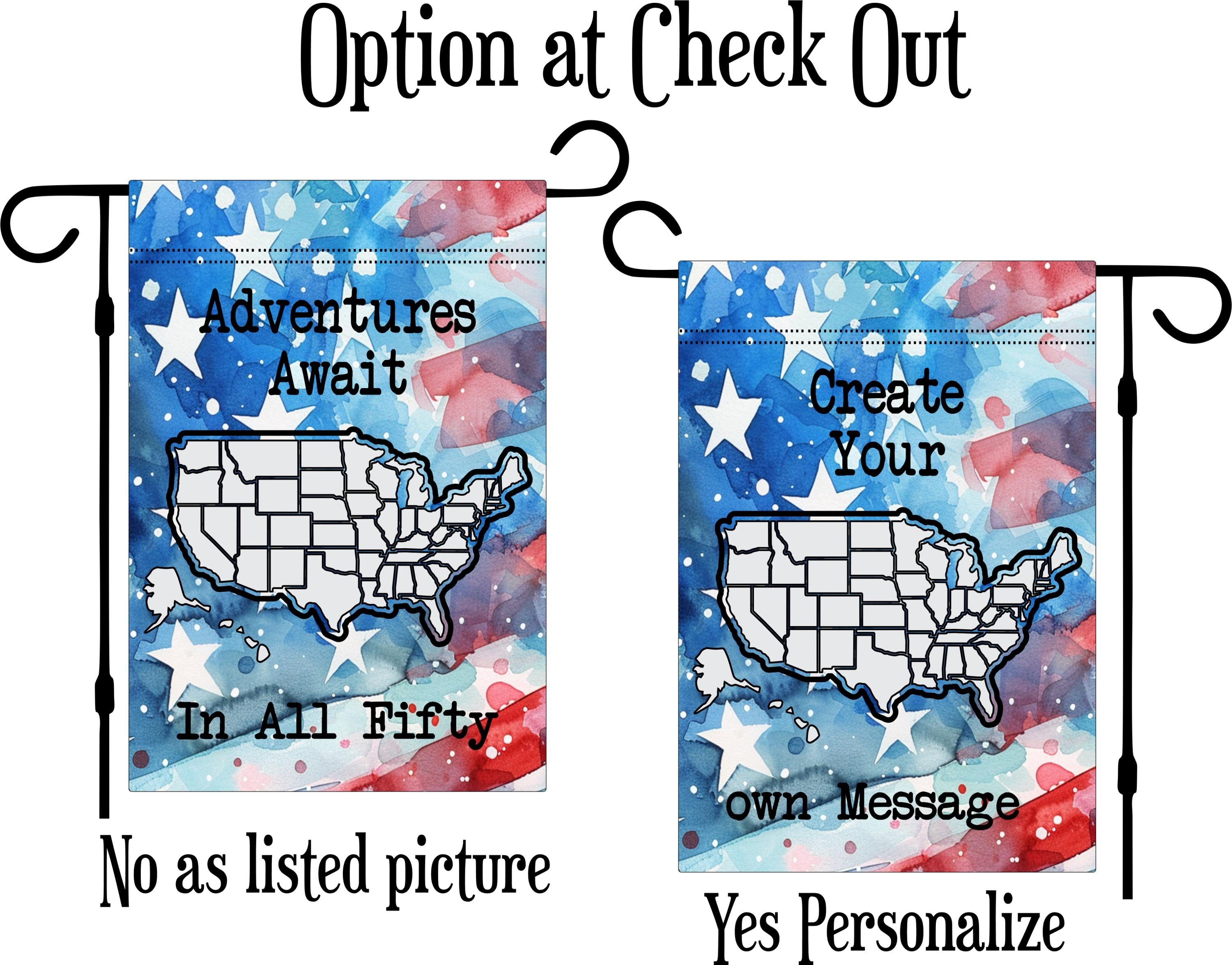This "Adventures Await in All Fifty" garden flag is the perfect way to celebrate your road trip memories and display your love of travel. Featuring a USA map outline, this interactive flag is ready to be colored in as you explore each state. It makes a fun and meaningful keepsake for families, RV travelers, and adventurers of all ages.