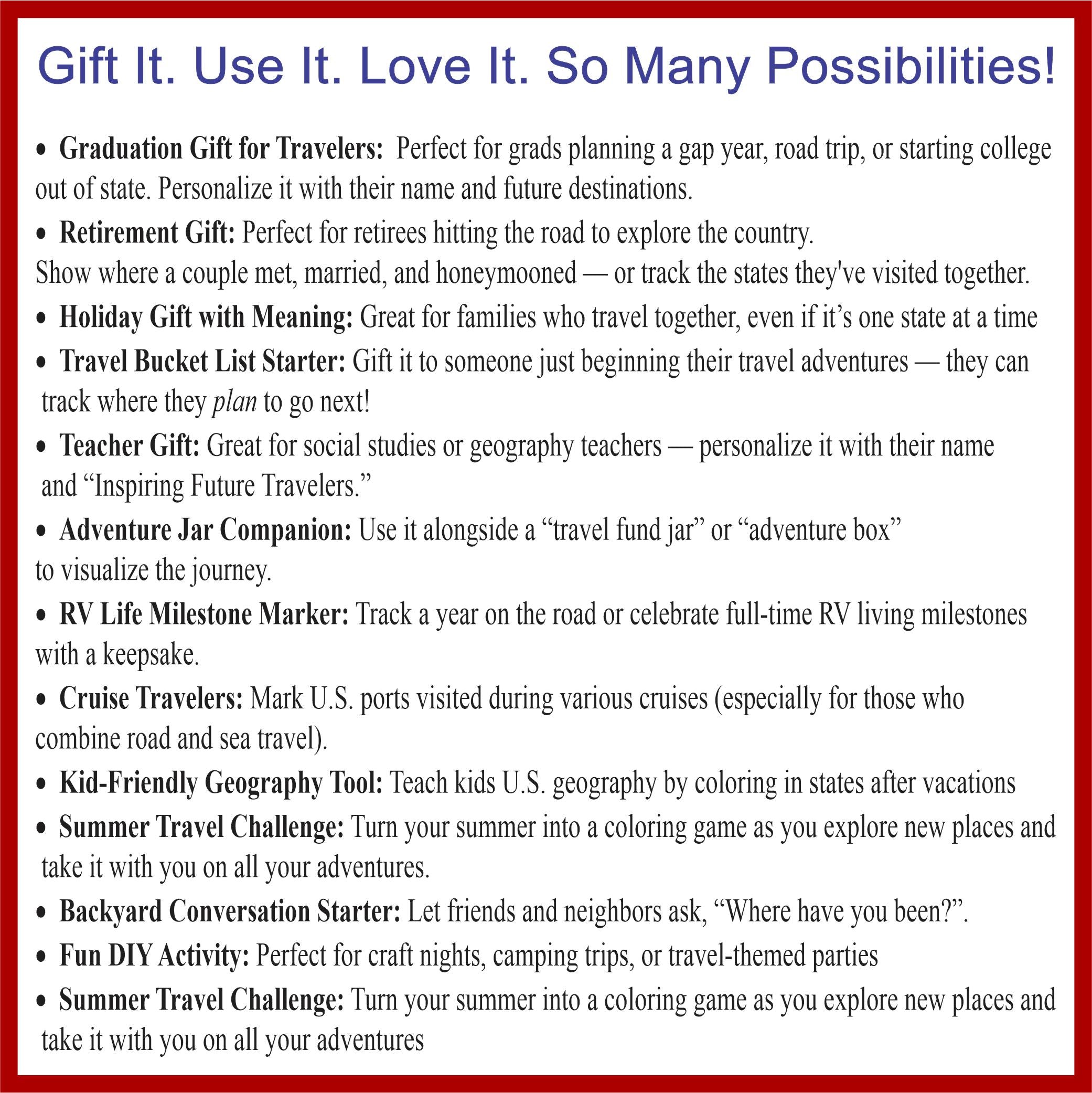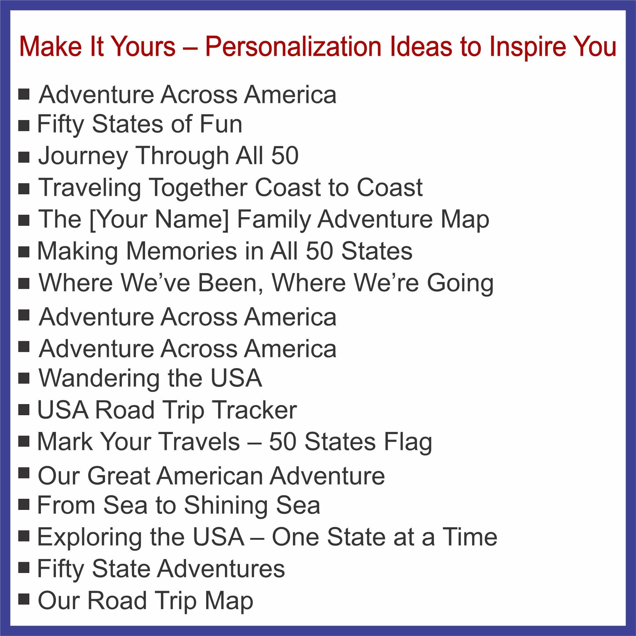 Design: USA map with bold “Adventures Await in All Fifty” text